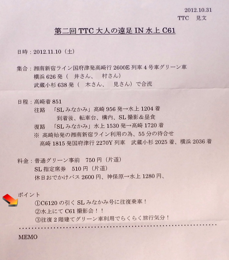 明後日はいよいよ「TTC大人の遠足IN水上・C61乗車」です。