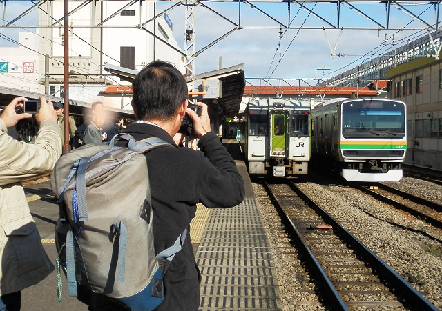 11月10日、TTC会員4名にてC61乗車・大人の遠足に行って来ました。 武蔵小杉駅です。 湘南新宿ライン2600E(638)で出発! 道中長いので座席はグリーンです。 神奈川県民の好物、ハマのシウマイ弁当! 高崎駅到着! 115の国鉄カラーにシビレます。 車両止、TTCのレイアウトと同タイプです!(F氏) 重装備D51のようです。 流石はヤマ男です。 C61カマを見る前に高崎のカマを見てしまいました・・ K氏曰く、すね毛が・・ いよいよです。 やってきました。 41年ぶりの再会です! またまた、国鉄カラーです。 12系に乗車です! おビールは量重視タイプと質重視タイプとに分かれます。 K氏の用意して頂いた「おやつセット」には泣けました! ☆ユカイさんの半そでが心配です・・ つづく・・ PR