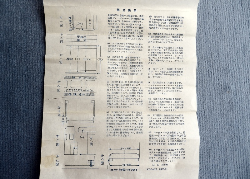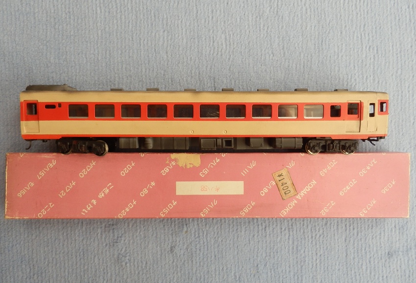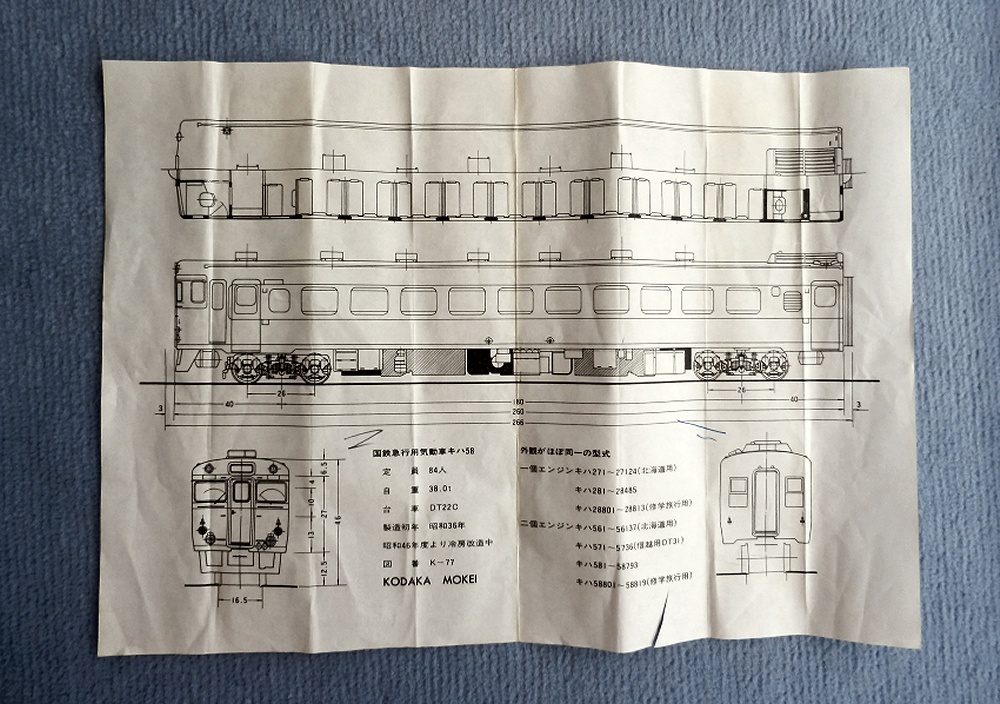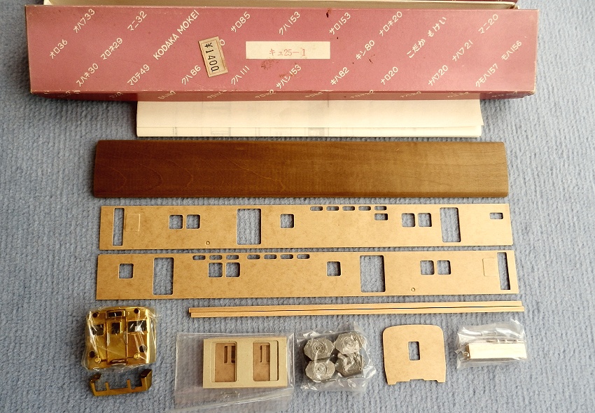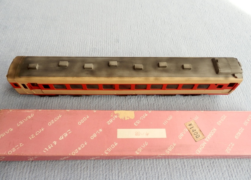 40年位前の小高ペーパーキットです。 ブラスの編成物完成品なんぞ、とてもじゃないけど手が出ない時代、 ペーパー車輌で、なんぼ夢をいただいたことか・・と思うのであります。 それと、何といってもコツコツ作ることの忍耐力、いやそうじゃなくて形が出来上がる 過程の喜びだったかなぁ。 解らなくなったときは模型屋のおやじさんから聞く能力も必要でしたね。 キハ58を2両作ったあと、そのまま手つかずになっているキユ25、 |
