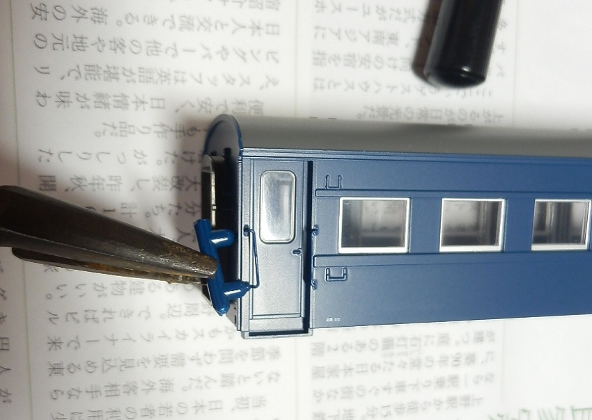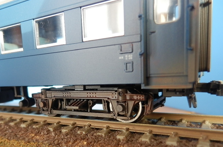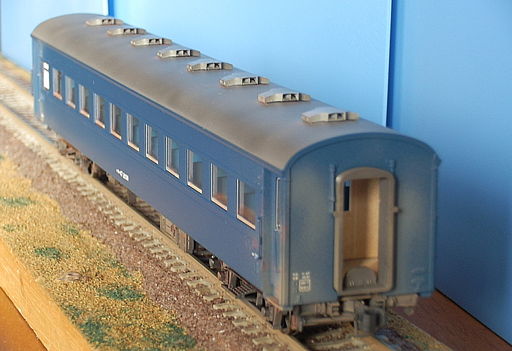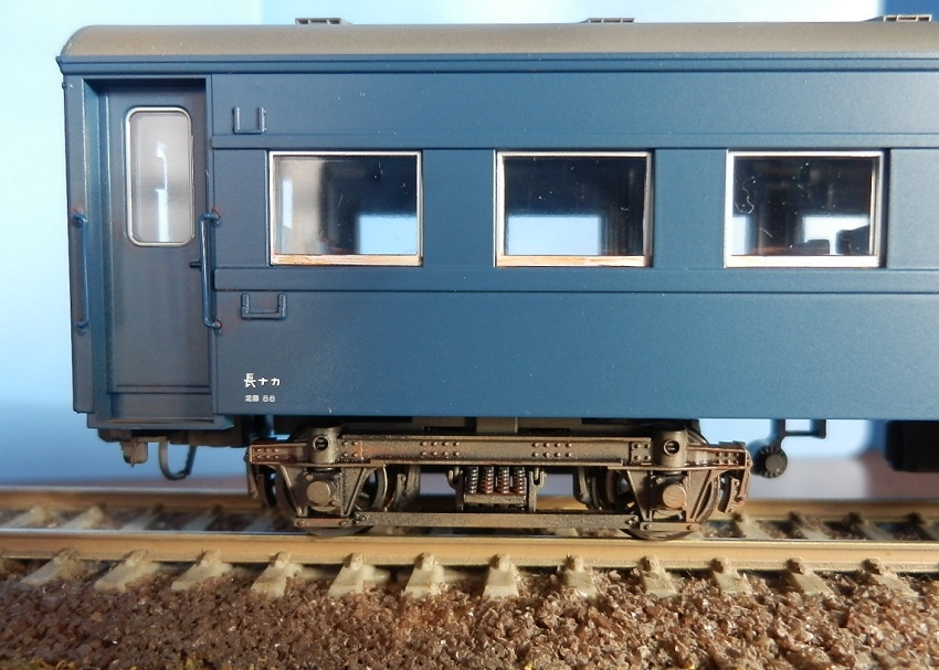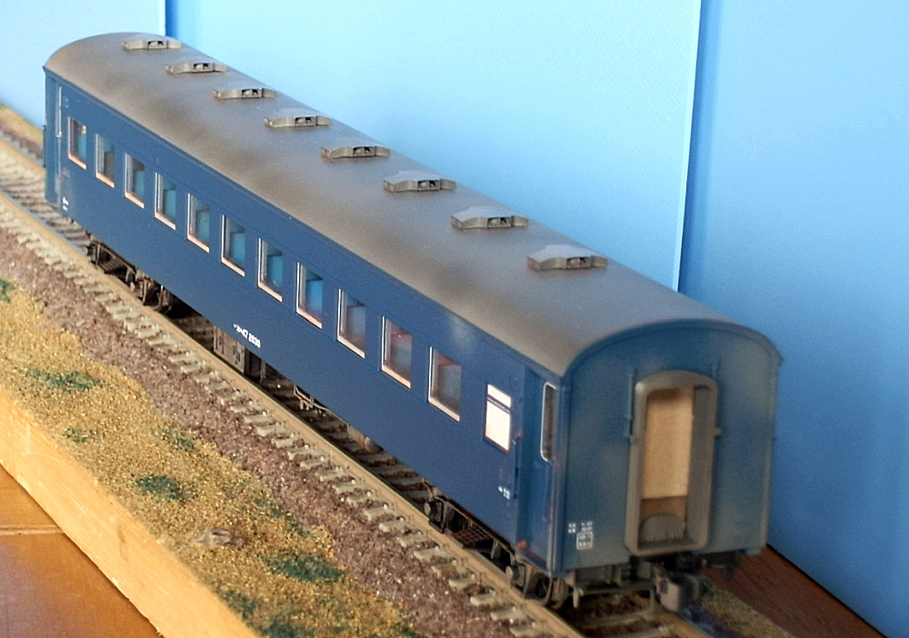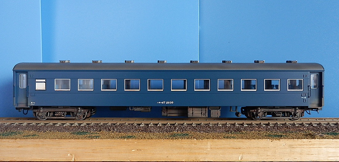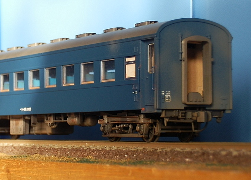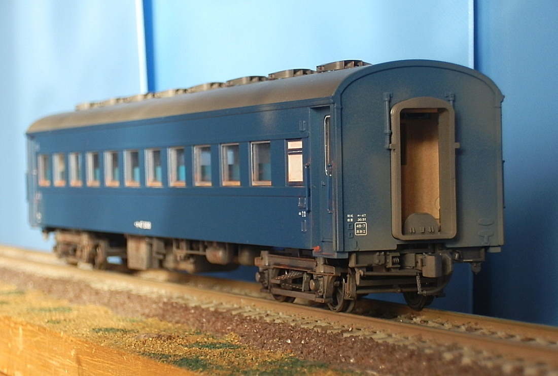 15歳での東北二人旅の始まりは上野発の夜行列車でした。 当時を思うと、寝台車利用はおダイジンしか乗れない高根の花。 当然ボクラは、ニスの匂いとたばこの臭いがするスハ43系の、 背もたれが90度の席で好摩までがんばったのでした。 長い客車列車は、停車するときはいいのですが、 発車のときの、ガッチャ~ンと連結器の音、ガックンと前後に揺れ、 絶対に熟睡できません。 降りたときは、なんだか体が揺れているような・・・ そんな思い出に浸りながら、軽工作してみました。 再発売された、KATOのオハ47です。 資料を見ると、S,46年春頃の八甲田の編成は 荷物車+スハフ42+スロ62+スハ43+「オハ47」・・・のようです。 アルミサッシの窓、モダンです。 台車、ピカピカです。 ベンチレーターと手すりをつけるだけなので、深夜で目がボーとしてもすぐに 出来そうです。 手すりは、半分だけ切り取り押し込みます。 ・・が パチ~ンと2本、空中に旅経っていきました。 前回の反省というか学習により、予備の手すり、買っておいて良かったぁ 台車は半艶のエナメル塗装しておきます。 |