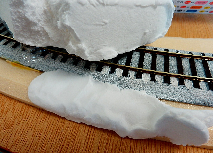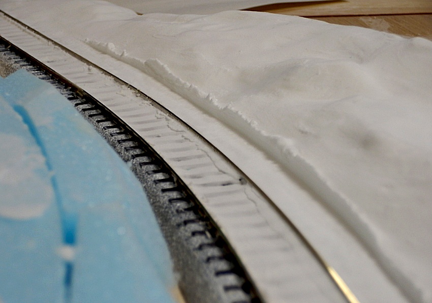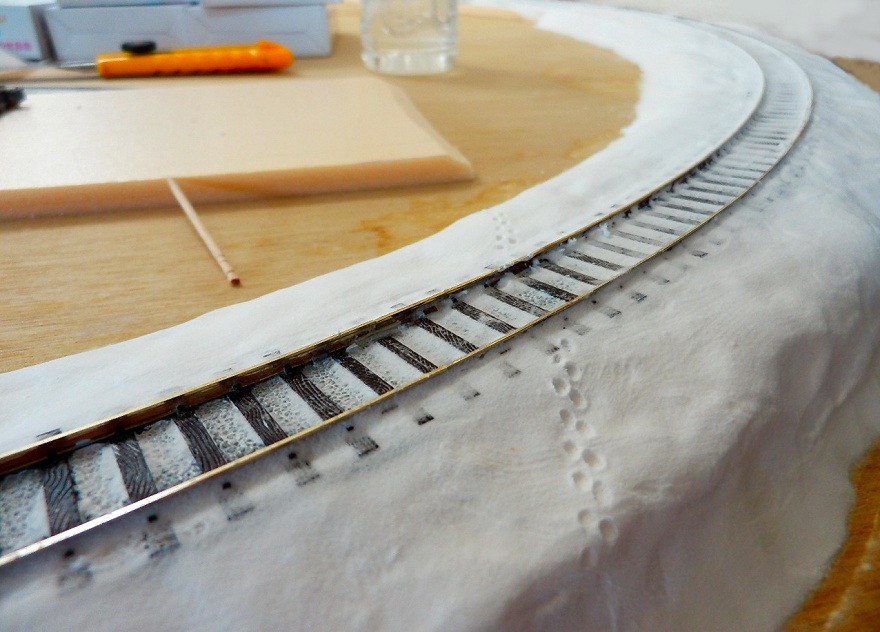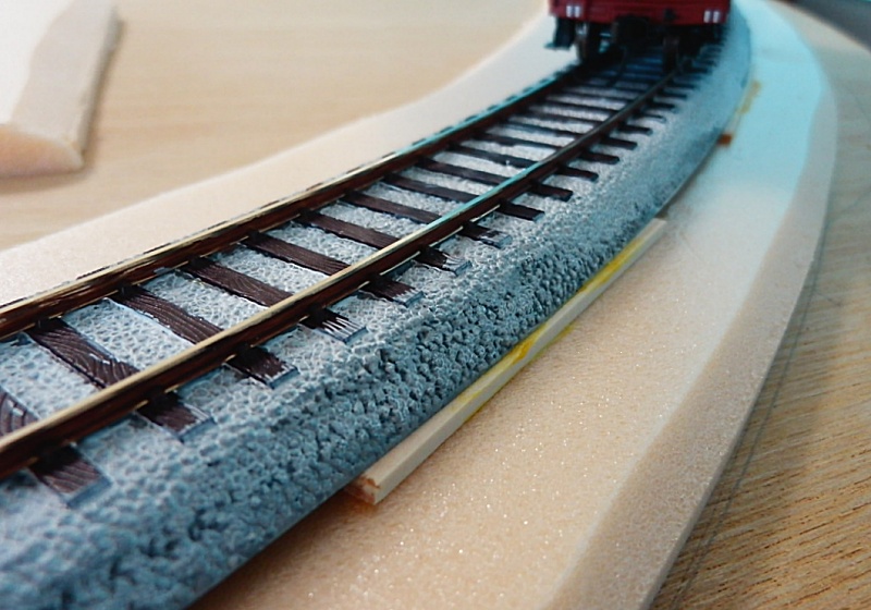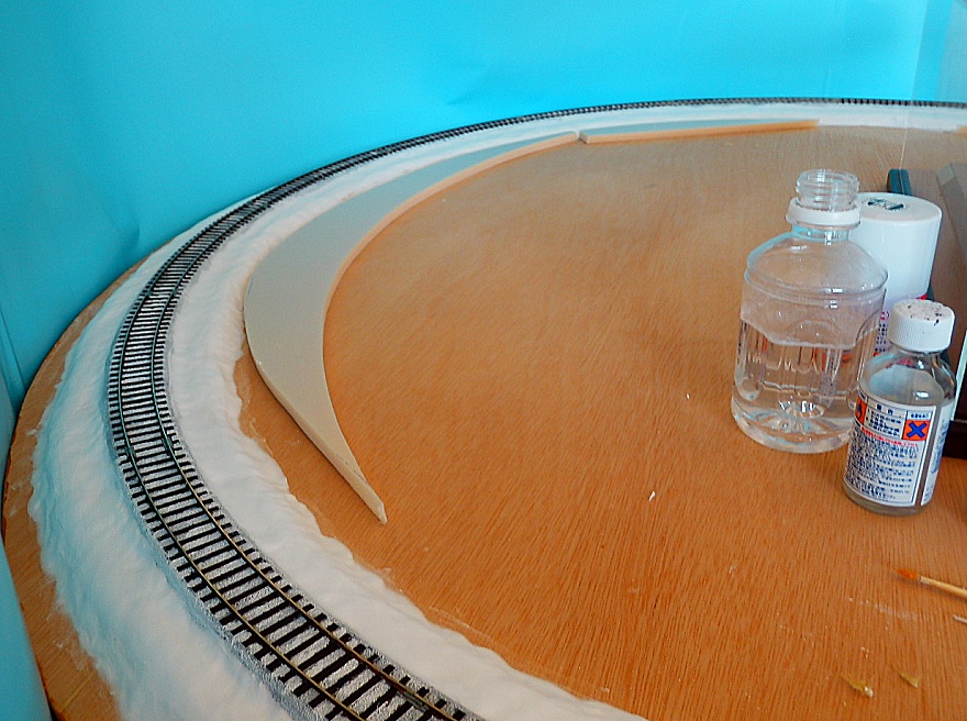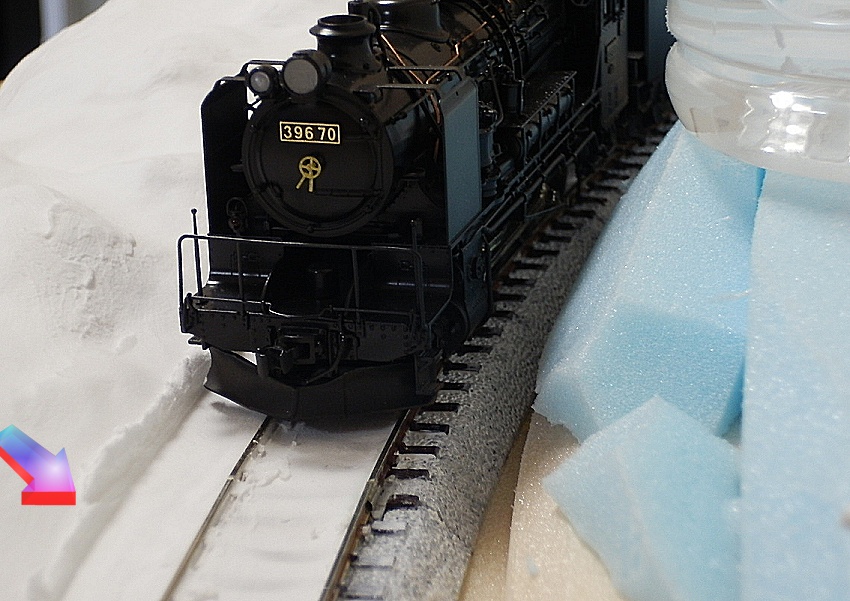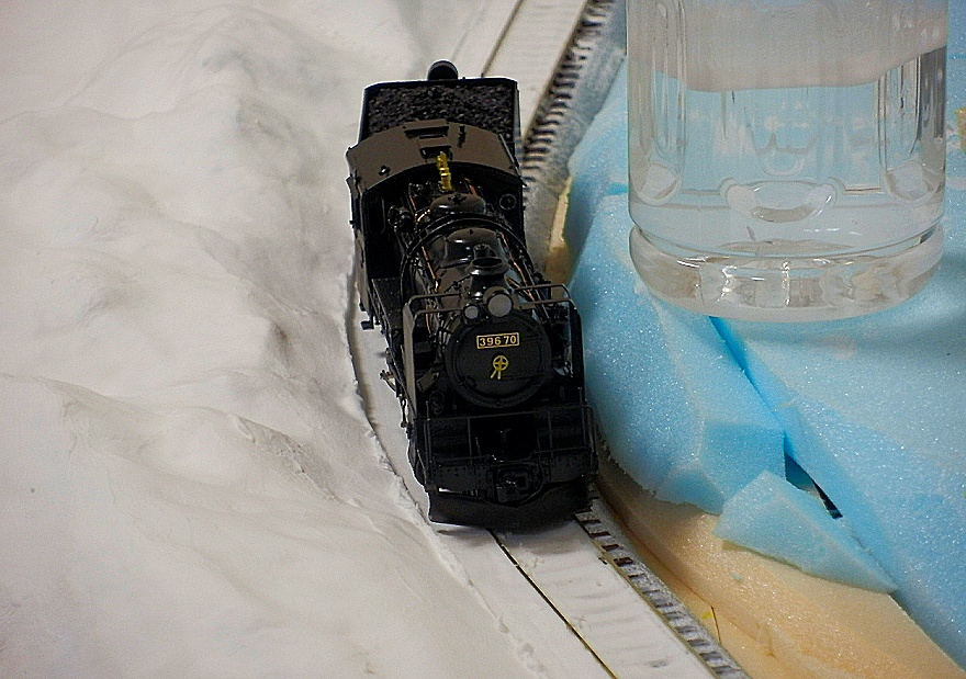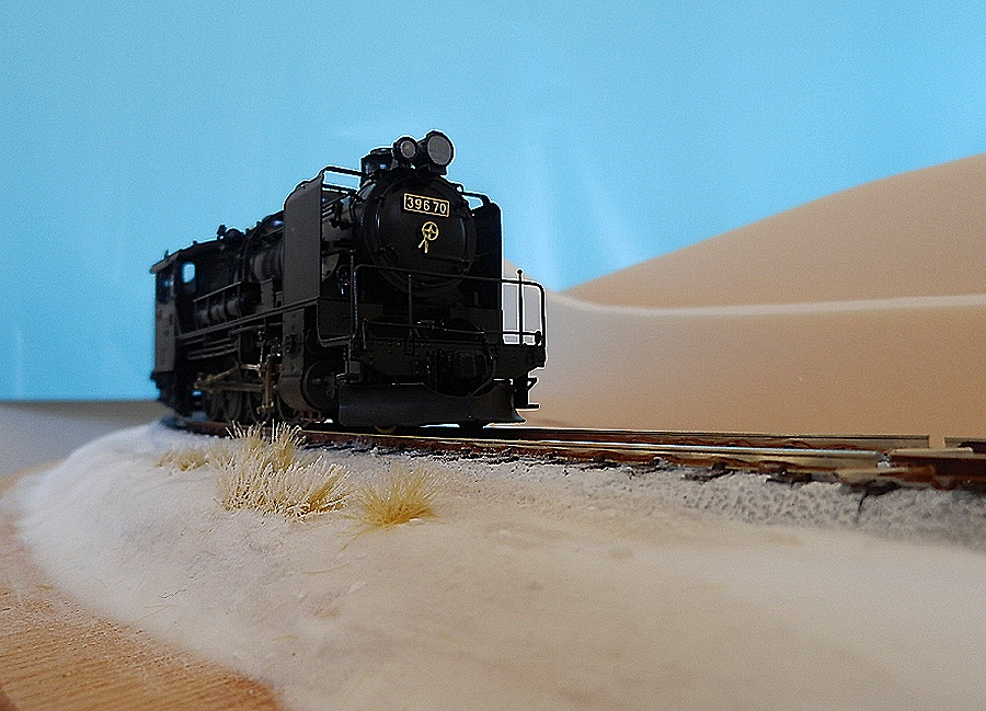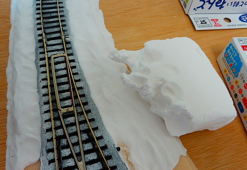 実物は狭軌では105ミリが上限とのことです。 ・・っということは模型では1.31ミリ。 道床に1.5ミリ角材を挟むと丁度良い角度になりそうです。 背面側にR670を1本挟んで緩和曲線を設け、角度を上げていきました。 次に曲線の犬走りを白紙ねんどかためていきます。 この紙ねんどは軽くて耐久性があり、接着性もあるのでとても重宝します。 クリームチーズみたいです。 半乾きくらいになったら、水で表面を整え、フワァッとした感じにします。 道床との境目はテクスチャーペイントを使いました。 ようじの先をちょいと潰して、足跡を・・ 手前はかんじき跡みたいです。 ミニネイチャー(草の茂み・黄金色6mm)を植えて・・ 軽くホワイトスプレーを吹きかけてみました。 機関車を配置して、記念撮影です。 20%程度程埋めてみました。 背面側にいくに従い、枕木も雪で埋もれた表現にしていく予定です。 雪中で撮影したアルバムをじっくり観てみないと・・。