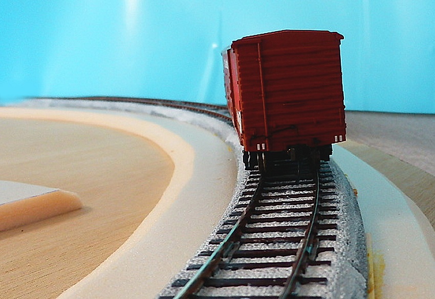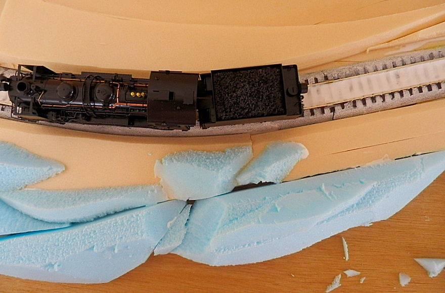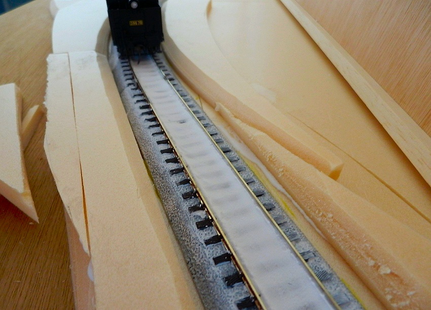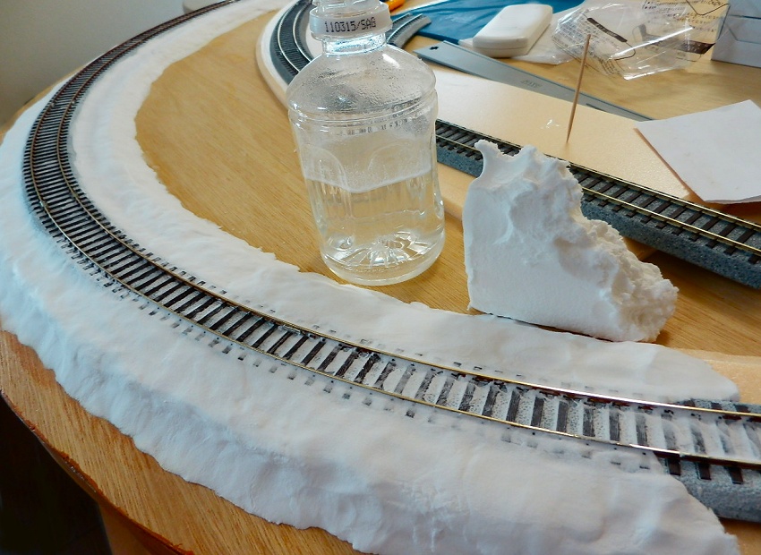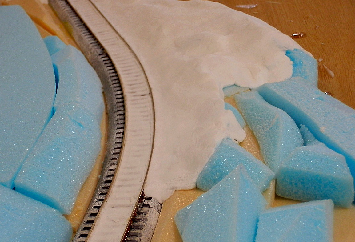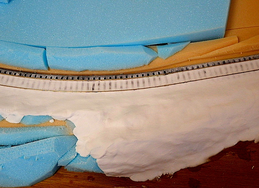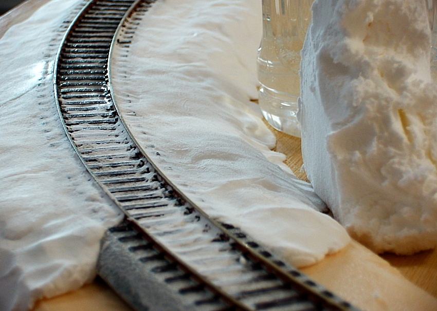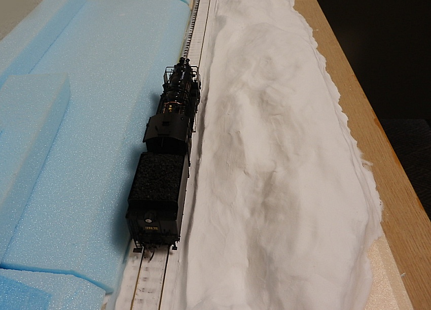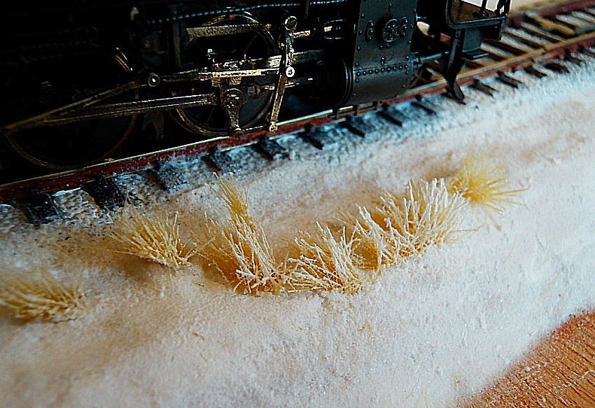 実物は狭軌では105ミリが上限とのことです。 ・・っということは模型では1.31ミリ。 道床に1.5ミリ角材を挟むと丁度良い角度になりそうです。 背面側にR670を1本挟んで緩和曲線を設け、角度を上げていきました。 次に曲線の犬走りを白紙ねんどかためていきます。 この紙ねんどは軽くて耐久性があり、接着性もあるのでとても重宝します。 クリームチーズみたいです。 半乾きくらいになったら、水で表面を整え、フワァッとした感じにします。 道床との境目はテクスチャーペイントを使いました。 ようじの先をちょいと潰して、足跡を・・ 手前はかんじき跡みたいです。 ミニネイチャー(草の茂み・黄金色6mm)を植えて・・ 軽くホワイトスプレーを吹きかけてみました。 機関車を配置して、記念撮影です。 20%程度程埋めてみました。 背面側にいくに従い、枕木も雪で埋もれた表現にしていく予定です。 雪中で撮影したアルバムをじっくり観てみないと・・。