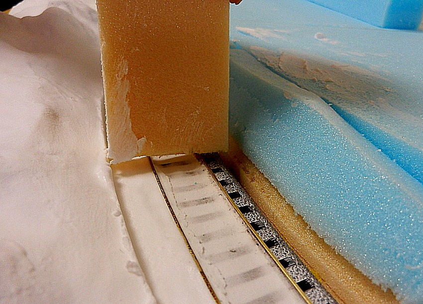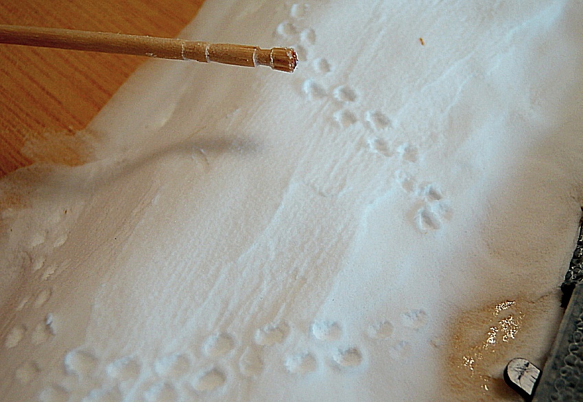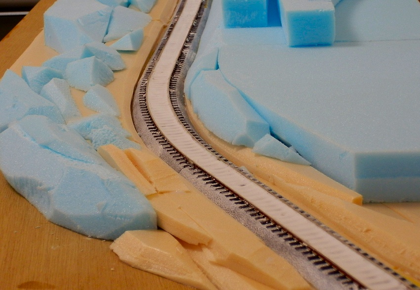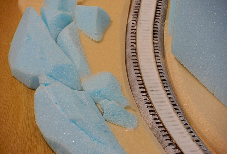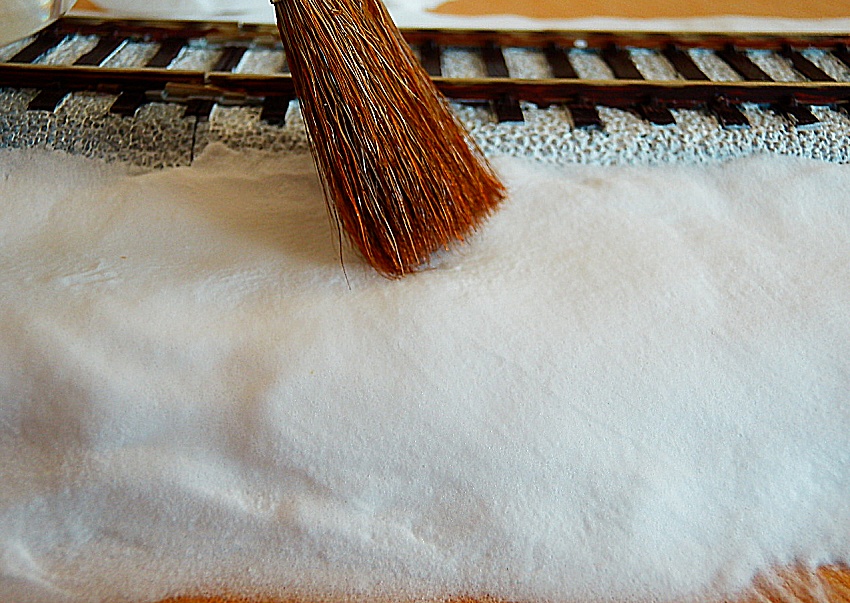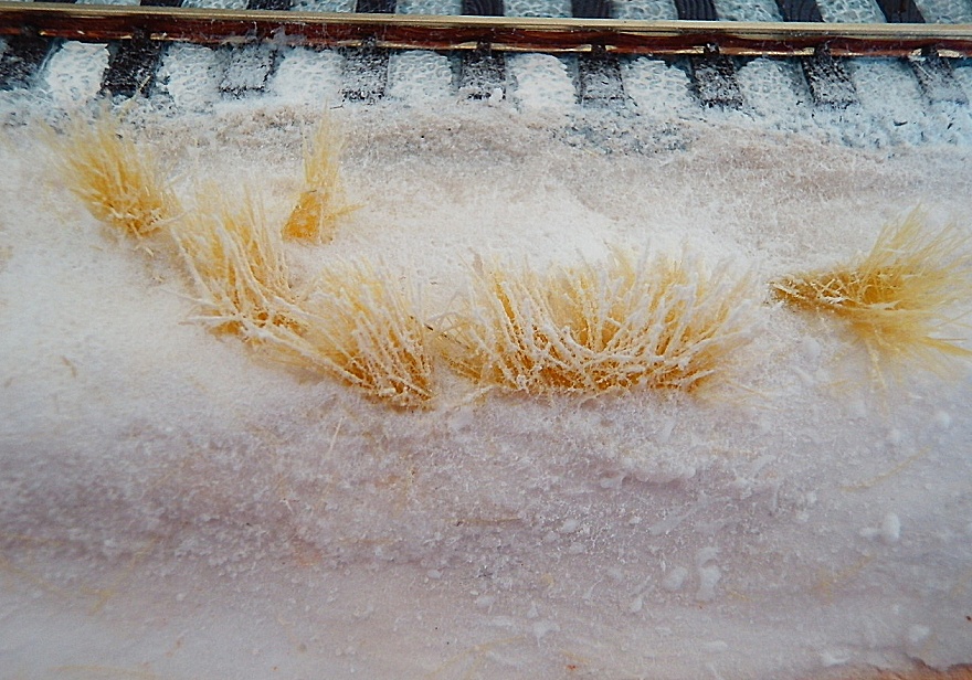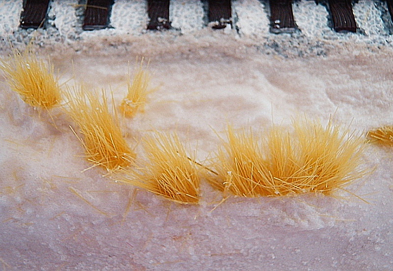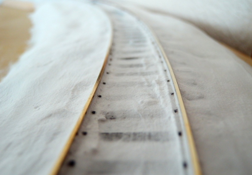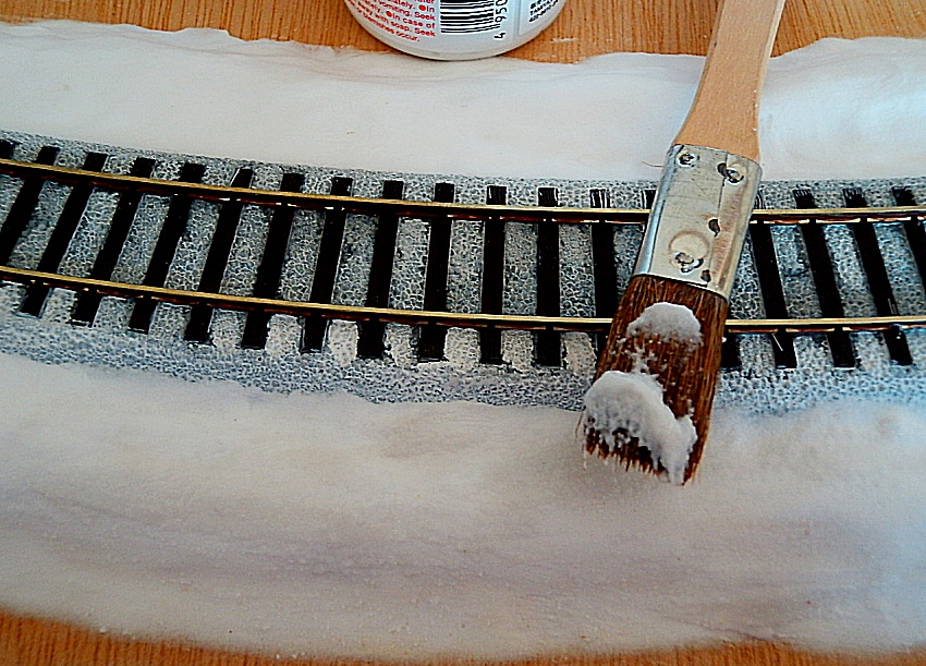 実物は狭軌では105ミリが上限とのことです。 ・・っということは模型では1.31ミリ。 道床に1.5ミリ角材を挟むと丁度良い角度になりそうです。 背面側にR670を1本挟んで緩和曲線を設け、角度を上げていきました。 次に曲線の犬走りを白紙ねんどかためていきます。 この紙ねんどは軽くて耐久性があり、接着性もあるのでとても重宝します。 クリームチーズみたいです。 半乾きくらいになったら、水で表面を整え、フワァッとした感じにします。 道床との境目はテクスチャーペイントを使いました。 ようじの先をちょいと潰して、足跡を・・ 手前はかんじき跡みたいです。 ミニネイチャー(草の茂み・黄金色6mm)を植えて・・ 軽くホワイトスプレーを吹きかけてみました。 機関車を配置して、記念撮影です。 20%程度程埋めてみました。 背面側にいくに従い、枕木も雪で埋もれた表現にしていく予定です。 雪中で撮影したアルバムをじっくり観てみないと・・。
