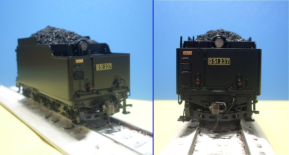 テンダーに石炭を積んでみました。 きっちりとカッターナイフで造形していきます。 当時、蒸機を上から見下ろすことがなかなか出来なかったのですが、 石炭は、キャブ屋根よりもかなり高く積んでいた印象がありました。 しかも円錐形で、尖がっていました。 はめた時に緩すぎないよう、かといって、きつ過ぎないように調整します。 右の天賞堂製は、大変デカイので下地に使うことにします。 左の製品はサイズが揃っているので、これを表面に使います。 模型ショウで買ったスーパーフィックスを使ってみます。 どはどばとふりかけます。 山積みですが少し変化をつけます。 台枠を着色しました。 展示台を雪化粧してみます。 北海道D51ですから・・ もちろん定石の紙粘土で塗りつけます。 展示してみました。 PR わが国鉄時代Vol 5が届きました! っということは・・・ おお、やりました、友人のとあわせて6枚掲載されています! 編集部の皆様、青春時代の宝物を載せて頂き、ありがとーございます。 皆様の写真に比べると、とても平凡なのですが、 当時、熱く燃えた「思い」のある写真なんです。 素晴らしい付録が付いています。 初めて買ったのは東北周遊券でした。 笑っちゃうくらいヘタクソな字です。 当時のメモ帳に4600円と書いてあります。 それにしても予算は9600とは! (キュウロクにあわせたのでしょうか?) それから良く利用したのがこれ! ダイヤ帳、自分で写してます。 コピーする予算がもったいなかったのでしょうか・・ このダイヤを見て考えることも楽しみの1つでした。 中学時代、親父に買ってもらった宝物。 当時、ニコンだのアサヒだの言っていたやつがいたのですが、そういう子は 蒸機が好きというよりもカメラが好きなんじゃねーかいと思いましたね。 こんな写真機ですが、マイナスの気温にも耐え、吹雪にも耐えて 蒸機を撮ってくれた思い出の宝物です。 3階ウィンドーには、3450系のツートン。 この群青色が懐かしいですワァ。 のぞみ工房のペーパー製らしい・・ よく出来てます。 ゴールデンラインにあるブラスの蒸機を眺めて、4階へ。 C62が一杯並んだ横に、プレートの付いていないD51北海道型があります。 ん~これは、と思い、箱を見せてもらうと、アンケート用紙など一式綺麗に揃ってます。 「ナンバーはつけないで走らせて遊んでいるおきゃくサン、いるんですよねえ~」 「あとは買っただけでしまい込んでるおきゃくサンもいるし、 こちらはそのタイプかもしれませんねえ」 とのことで、試走させてみました。 予想を覆し、滑らかに走ること。 再度じっくり点検しましたが、各パーツもひん曲がってないし、塗装の剥がれも無いようです。 いざ、ご決断を! ・・・・・ ・・・・・・・・ ん~いちゃいましょう、と天の声の指示により転属させてしまいました。 2輌のD51 微妙な違いがあります。 うしろが、パイプ煙突です。 滑らかに走るとはいえ、車輪は汚れているので、めん棒でクリーンリネスです。 テンダー車輪の内側は汚れています。 こちらは手で回しながらふき取るしかありませんね。 実はこれをやってみたかったのです! 「後部補機」 竜が森の8620の後部補機、見事でした。 大釈迦峠のD51、迫力満点でしたね。 D51 1087号機 初めてこの機関車を観た時、ほんとにたまげましたワ。 戦時型だからカマボコドームは関東でも786号機などを観ていたのだけど、 密閉キャブ、重油装置付き船底テンダーですからね。 当時は、なんちゅーかっこやあ・・と思ったのですが、 今こうして観ると個性的な機関車ほど味がありますな。 パソコンを自分なりに駆使しまして、 写真の2枚あわせをやってみました。 若干、合わせ目が判りますが、デジタルだと綺麗に出来ますね。 2009年9月のレイルマガジンの付録、機関車表CDで、 この機関車の生い立ちを紐解いてみましたが、不明なことが多く、 最終配置は弘前、1973年廃車・・と記載されていました。 早朝、信越本線安中駅に寄りました。 駅員さんに「115系」は何時頃きますですか? と尋ねると、「ちょいとまっとこれ」 と親切に調べて頂き、 「あ~っと11時31分と12時19分だな」 とても待ってられません。 でもせっかくだから入場券を支払いホームへ。 とりあえず記念に撮影。 写真を撮っていると 「乗りますか」 と車掌さん。 ほんとに親切ですね。 東邦亜鉛製錬所の可愛らしいDLでしょうか。 駅横の「そばMARU」です。 生パスタがおすすめです。 とても美味しいです。 オヒョイさんのお店のシェフにパスタソースの味付けのアドバイスを頂いたとか・・ お近くに来られたときは是非お試しあれ! お仕事の途中、高崎へGO。 湘南色の115系まだおりますな。 機関区の周りを散策 機関庫の入り口からEF65を観ることができました。 535号機のようですね。 |