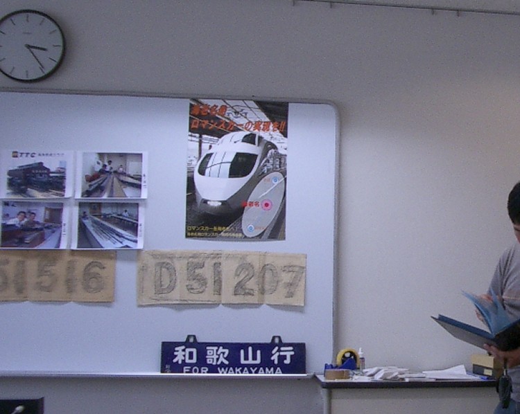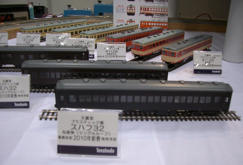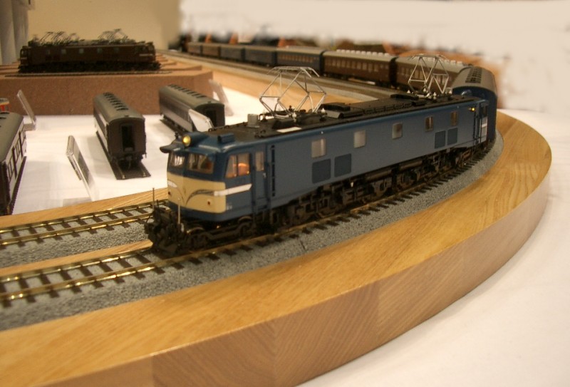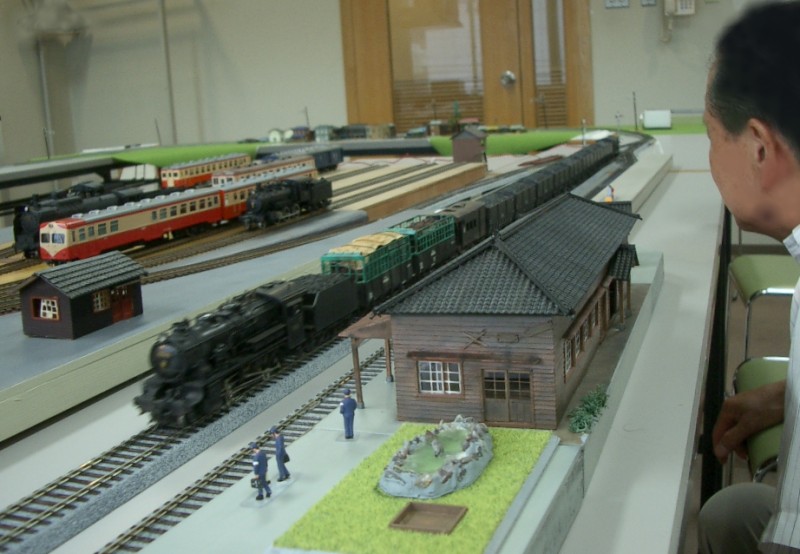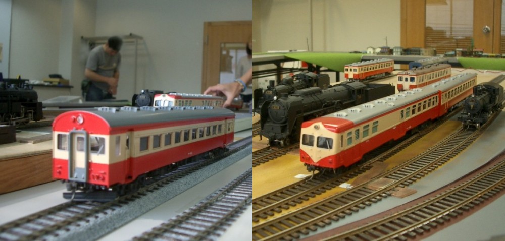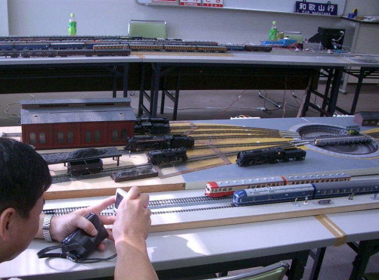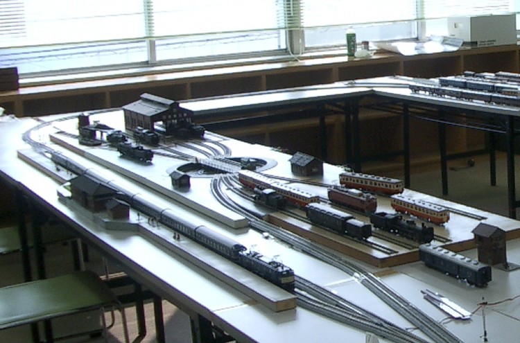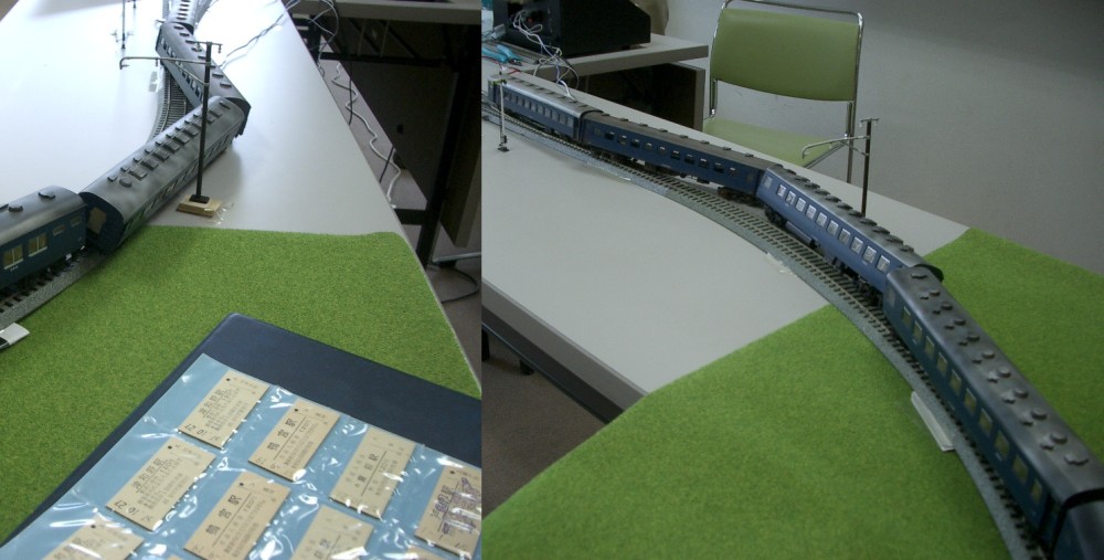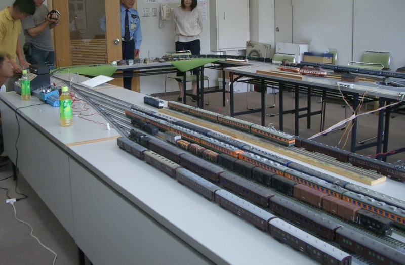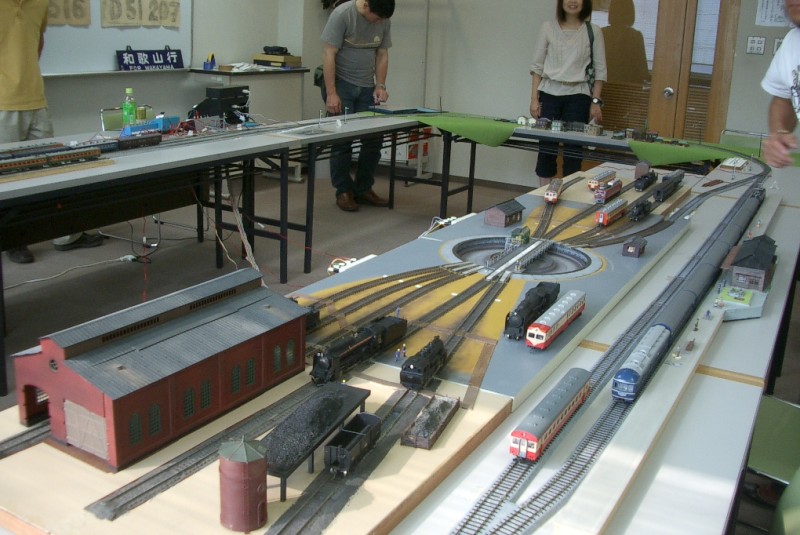開けたついでに、運転士を乗せてみましたが、頭ひとつ高くなってしまい PR 今回の運転会ではカンタムD51.EF58を走らせました。 サウンドがあると運転会の楽しさが倍増でした。 D51は走行よりも停車中のコンプレッサー音等がいいですね。 ただ、スピードを上げた時の音質は、SL1のほうが、リアルだと思います。 ゴハチは・・・ やはり、汽笛がいいです。 それと、停車寸前のブレーキの軋み音は、皆さん爆笑でした。 ギギギ・・・・ フランジ音は、とっても実感的ですネ。 できれば、中川家(鼻声)の声質で 「出発進行!」 「場内減速45!」 なんていうスイッチもあっていいんじゃないかナ。 いずれにしても、カンタム車輌は、 小さな机上で往復運転でも楽しめるので、今度、陳列ケースに配線してみよう! シュッシュッシュッ・・・ブラスト音も軽やかに駅舎の前を通りぬけていきます。 やっぱ、蒸気っていーよねえ! 「ウンウン」 ・・ と、みんな うなずいてます。 4回目の運転会は、丁度1周年の節目。 ようやく搬入・設置作業も慣れてきました。 お昼頃でしょうか。 ドアの外から・・ 「高津鉄道クラブさんですか?」 「え~ハイ、そうですが」 「ブログとホームページ見てきました!」 お話をすると、Nゲージのクラブは多いけどHOゲージのクラブはほとんど無いらしい。 簡単にあいさつを済ませ、メンバーに加わって頂きました。 蒸気やDCを数量持参され早速運転開始。 共通の趣味で、こういったご縁ができるってほんとに素晴らしいと思います。 なかなかチャンスが無く、動かさないHOゲージャーさんも多いらしい。 みんなでワイワイ、ガンガン走らせるのも一入ですヨ。 次は12月の予定です。 お気軽に参加してください。 HOゲージ・・・・どーでもいいことですが、会話で16番というよりは、 エッチオーと言ったほうが 会話の流れがあるんです。 僕らが始めた頃はみんなこの言い方。 守衛さんもちょっと見せてくださあーいとニッコリ。 いいな、このジーゼルの前面窓、昭和だねとカシャ。(N氏) 色々個性的なDCの顔です (K氏) 新しく横浜機関区風給炭台を作りました(F氏) 当時この上に登ったら高かったこと。 「海老名発、ロマンスカーの実現を」のポスターを貼り、署名しました。(N嬢) あ”~、、、、 架線柱が横転を防いでくれました。 っといろいろありましたが、あっという間の一日でした。 ※カンタムの走行について次のブログに書きたいと思います。 |