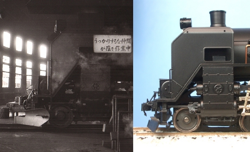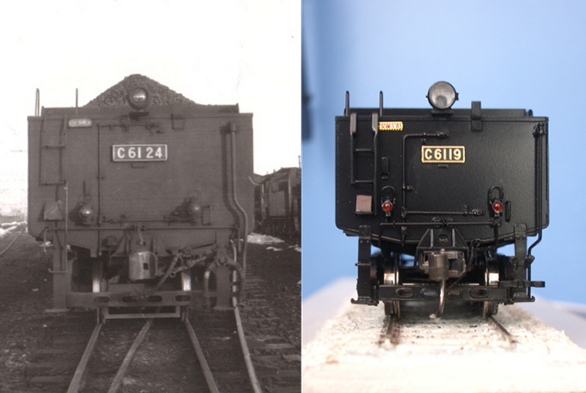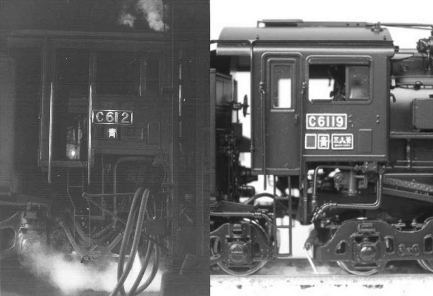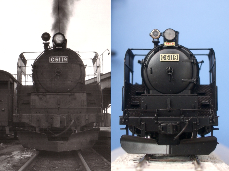 キャブ下のナンバープレートの位置は、説明書ではもっと右側でしたが、 ご覧のように、実物の写真では、区名札の真上にあります。 これは、仙台在籍時代では、その位置(右端)だったのか、一度調べてみたいと思います。 テンダー後部のステップ幅が違う以外は、忠実に良くまとまっていますネ。 高額な模型ですが、これだけのパーツをキッチリと綺麗に取り付け、蒸気模型として 重要な要素の一つである「低速でスムーズに良く走る」ことを考えれば、 ヨシとします。 モーター音は殆ど聞こえず、フライホイールの効果でしょうか、超低速は実写さながらです。 しかも、ドレイン音を利かせてゆっくりと発車する時は一入です。 ところで、MADE IN KOREAでも CH I N A でもいいから、もっとデテールやパイピング を減らした基本がしっかり出来ている「ブラス製のベーシック蒸気」を企画してほしいところ。 ボリューム感のある前面、良く捉えていますね。 奇しくもC61の模型が久々に発売された数日後に、C61の復活ニュースが 飛び込んで来るなんて、すっごいタイミングです。 依頼したLTMの取り付けの連絡があり、ようやく入線しました。 記念に実写のピックアップした写真と見比べてみました。 ■押し出し感のあるスノープロウ! ■ 模型は少し貧相ですネ 青森機関庫内で撮影しました。 プシュ~・・・カッタンカッタンカッタン・・・ 生きています。 薄暗い庫内に響き渡る、スチーム音やコンプレッサー音。 扇型の機関庫内には待機、点検中の蒸気が5~6両はいたかと思います。 おお~ すげ~と感動し、シャッターを切ります。 カメラの絞りを開け、シャッタースピードを落としたり 当時、子供ながらに工夫しながら写真を撮ったのですが・・・ なんとか見えるのはほんの数枚のみ。 でもこのように資料写真としての貴重な1枚です。 |
