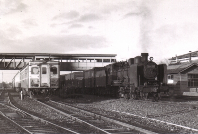 バス窓のディーゼルと大正の名機8620牽引の貨物列車。